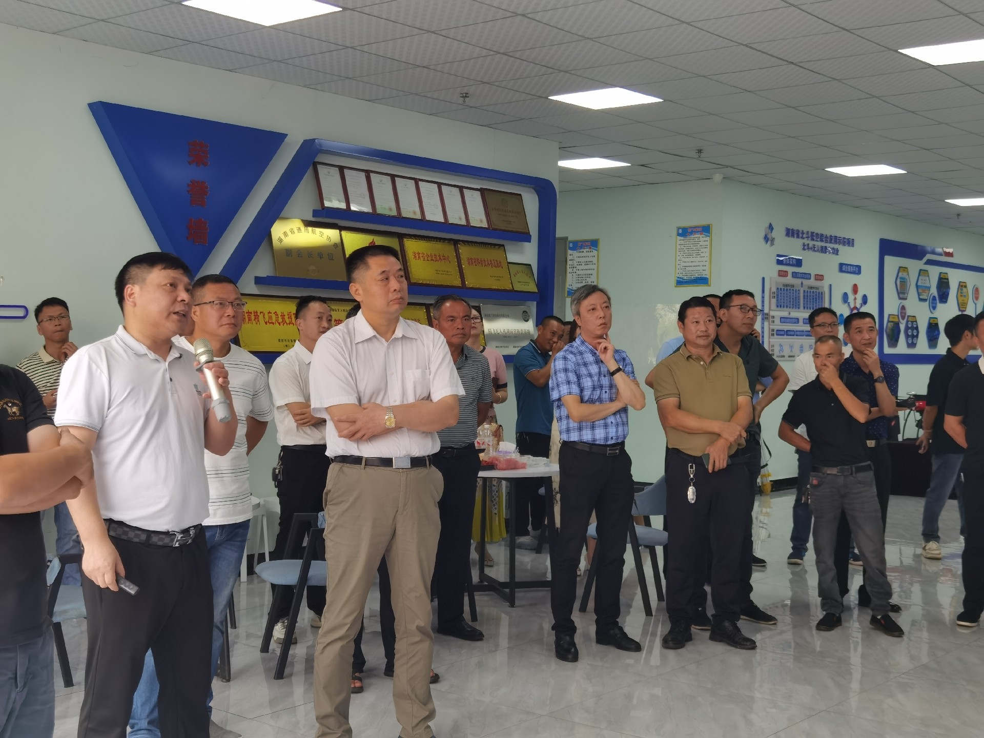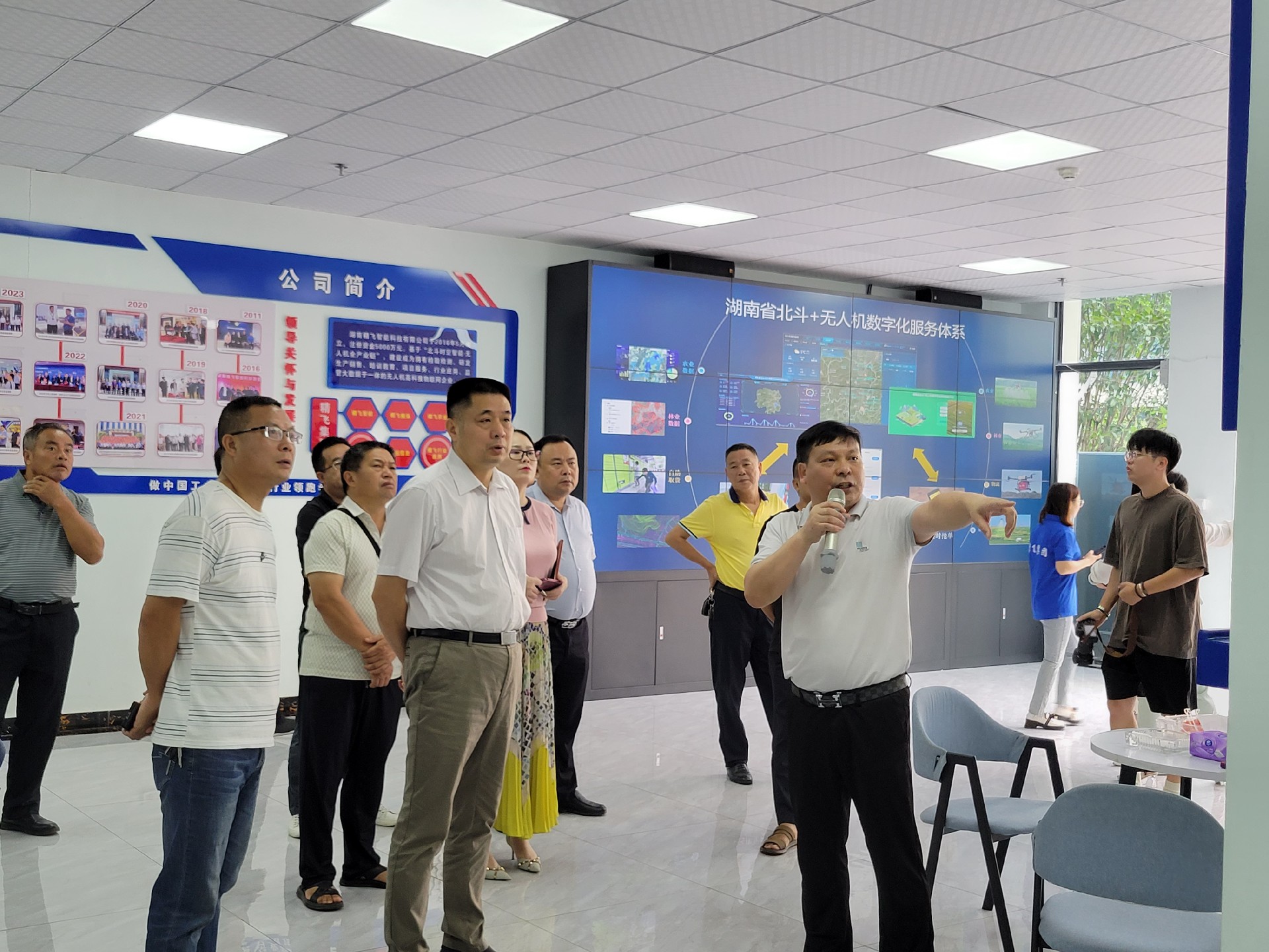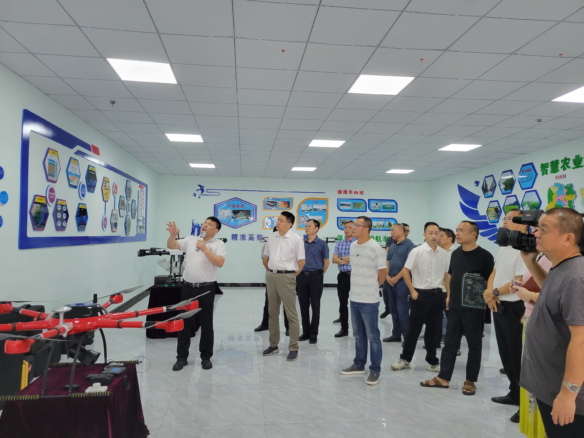 在精飛智能展廳,精飛集團董事長龍永堅向調研組一行匯報了企業(yè)生產經營、技術研發(fā)、產品銷售等情況,其中重點講解了無人機數字農業(yè)服務應用示范建設項目及自主開發(fā)的全國首個“北斗+無人機數字農業(yè)綜合應用與公共服務”平臺運營情況。