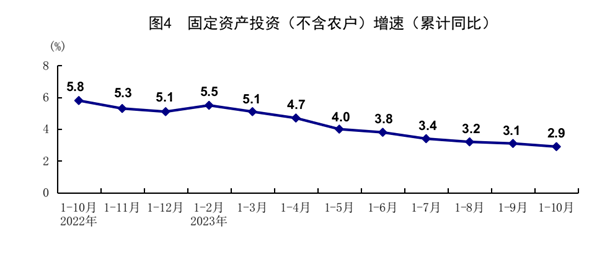 1-10月份,全國固定資產(chǎn)投資(不含農(nóng)戶)419409億元,同比增長2.9%,比1-9月份回落0.2個百分點(diǎn)。分領(lǐng)域看,基礎(chǔ)設(shè)施投資同比增長5.9%,制造業(yè)投資增長6.2%,房地產(chǎn)開發(fā)投資下降9.3%。全國商品房銷售面積92579萬平方米,同比下降7.8%;商品房銷售額97161億元,下降4.9%。分產(chǎn)業(yè)看,第一產(chǎn)業(yè)投資同比下降1.3%,第二產(chǎn)業(yè)投資增長9.0%,第三產(chǎn)業(yè)投資增長0.4%。民間投資下降0.5%,降幅比1-9月份收窄0.1個百分點(diǎn);扣除房地產(chǎn)開發(fā)投資,民間投資同比增長9.1%。高技術(shù)產(chǎn)業(yè)投資同比增長11.1%,其中高技術(shù)制造業(yè)和高技術(shù)服務(wù)業(yè)投資分別增長11.3%、10.5%。高技術(shù)制造業(yè)中,航空、航天器及設(shè)備制造業(yè),醫(yī)療儀器設(shè)備及儀器儀表制造業(yè)投資分別增長19.0%、16.7%;高技術(shù)服務(wù)業(yè)中,科技成果轉(zhuǎn)化服務(wù)業(yè)、專業(yè)技術(shù)服務(wù)業(yè)投資分別增長37.3%、29.1%。10月份,固定資產(chǎn)投資(不含農(nóng)戶)環(huán)比增長0.10%。