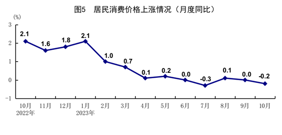 10月份,全國居民消費(fèi)價格(CPI)同比下降0.2%,環(huán)比下降0.1%。分類別看,食品煙酒價格同比下降2.1%,衣著價格上漲1.1%,居住價格上漲0.3%,生活用品及服務(wù)價格下降0.6%,交通通信價格下降0.9%,教育文化娛樂價格上漲2.3%,醫(yī)療保健價格上漲1.3%,其他用品及服務(wù)價格上漲3.6%。在食品煙酒價格中,豬肉價格下降30.1%,鮮菜價格下降3.8%,糧食價格上漲0.6%,鮮果價格上漲2.2%。扣除食品和能源價格后的核心CPI同比上漲0.6%。1-10月份,全國居民消費(fèi)價格同比上漲0.4%。